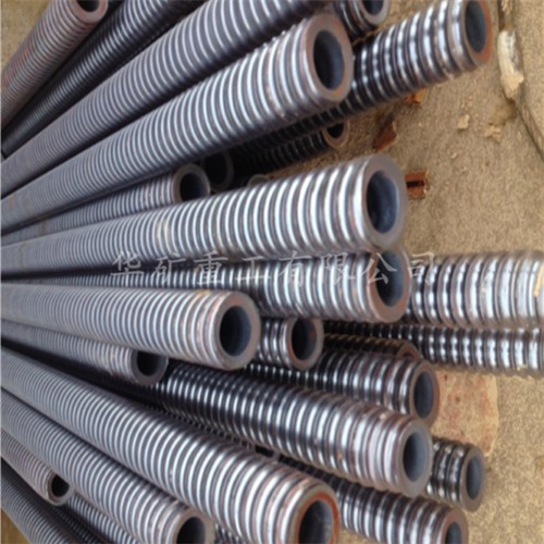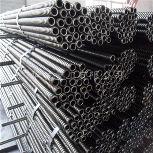 中空錨桿的錨桿體采用中空設(shè)計(jì),桿體中孔作為鉆進(jìn)高壓風(fēng)水通道和注漿通道,與實(shí)心桿體相比,中空桿體設(shè)計(jì)可獲得更好的剛度和抗剪強(qiáng)度。錨桿體外表面全長標(biāo)準(zhǔn)大螺距螺紋結(jié)構(gòu),螺紋結(jié)構(gòu)便于錨桿的切割和接長,與光滑桿體相比增加了錨桿體與注漿材料的粘接面積從而提高了錨固力。