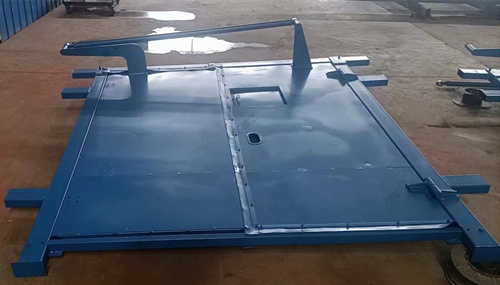 礦用無壓風門適用于煤礦井下巷道任何需要安設風門的地點。無壓風門采用壓力平衡原理,每道風門為雙扇鋼制門框異向同步開閉,運用聯(lián)桿平衡機構(gòu)把作用在風門上的壓力通過聯(lián)桿平衡機構(gòu)轉(zhuǎn)化為一種內(nèi)力并得到平衡,保證了風門打開時省力、方便靈活。由于壓力平衡式風門為異向開閉,因此無論風流方向如何,兩扇門均同時受到風流的推力和風流的壓力,而且大小相等。另外在門框橫梁上的風門開啟方向的異側(cè),焊接擋板確保風流反向時風門不被吹開。同時通過配重塊產(chǎn)生的牽引力實現(xiàn)風門自動關(guān)閉。