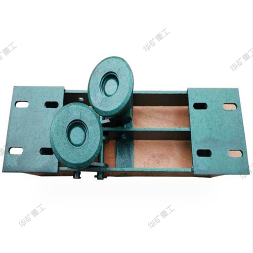 為保證無極繩連續(xù)牽引車鋼絲繩有一定的初張力必須配置張緊裝置。本設備張緊裝置為重錘式,主要由框架、張緊繩輪、動輪組、轉(zhuǎn)向輪、配重塊和防護網(wǎng)等組成。該裝置可吸收鋼絲繩系統(tǒng)由于彈性變形而伸長的部分;同時,可為絞車提供尾張力,保證鋼絲繩在卷繩筒繩襯上有較穩(wěn)定的正壓力,而不致鋼絲繩在卷繩筒上打滑,使絞車可以正常牽,。由于系統(tǒng)用于雙向運輸,所以系統(tǒng)中設有兩組張緊裝置。