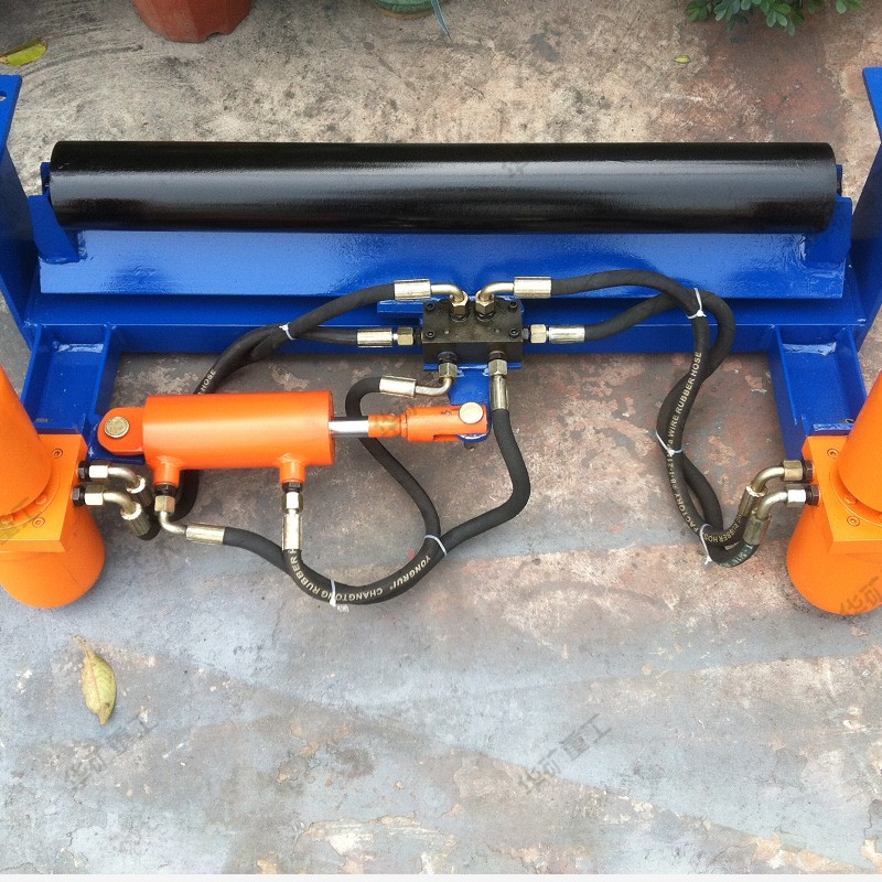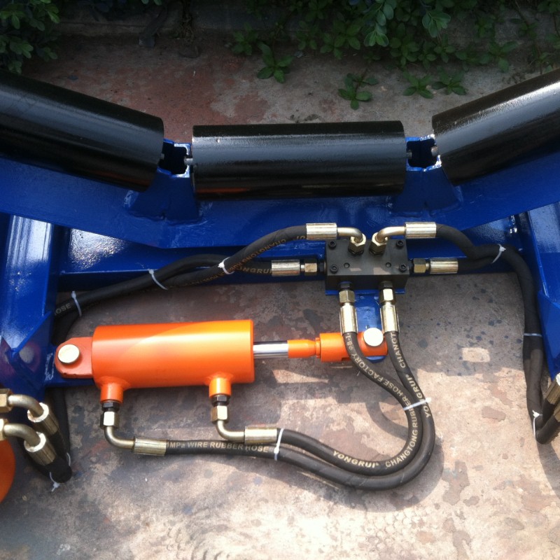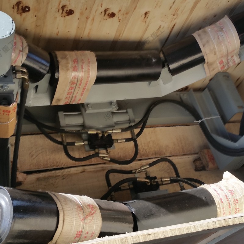 自動(dòng)液壓調(diào)偏裝置是由檢驅(qū)輪、油泵、復(fù)合油缸、油管、固定支架構(gòu)成。當(dāng)皮帶運(yùn)行跑偏時(shí),皮帶和檢驅(qū)輪接觸,檢驅(qū)輪帶動(dòng)油泵旋轉(zhuǎn),輸出液壓油控制驅(qū)動(dòng)油缸往復(fù)運(yùn)動(dòng),帶動(dòng)調(diào)心托輥偏轉(zhuǎn),使調(diào)心托輥的線運(yùn)動(dòng)方向與皮帶的運(yùn)動(dòng)方向形成一個(gè)夾角,產(chǎn)生的摩擦力驅(qū)動(dòng)皮帶,是皮帶始終在設(shè)定的范圍內(nèi)運(yùn)行,從而避免皮帶跑偏造散料、皮帶與皮帶機(jī)架摩擦撕帶,達(dá)到保護(hù)皮帶機(jī)正常運(yùn)行的目的。自動(dòng)液壓調(diào)偏裝置的核心部分為:一組液控?fù)Q向閥,它是由兩個(gè)液控?fù)Q向閥單體組成。每個(gè)液控?fù)Q向閥分別與一套檢驅(qū)輪泵組連接,兩個(gè)液控?fù)Q向閥共同控制一條油缸,來(lái)完成油缸的伸縮運(yùn)動(dòng),并且每個(gè)液控?fù)Q向閥之間互相影響,對(duì)油缸的控制迅速,準(zhǔn)確。產(chǎn)品屬性、結(jié)構(gòu)組成在機(jī)架上安裝一組調(diào)心托輥,在調(diào)心托輥的兩側(cè)相同高度垂直安裝兩只檢驅(qū)輪,檢驅(qū)輪轉(zhuǎn)軸與油泵的動(dòng)力輸入軸連接,分別把左右兩側(cè)的檢驅(qū)輪轉(zhuǎn)軸和油泵固定在機(jī)架上,調(diào)心托輥與左側(cè)固定支架之間設(shè)置復(fù)合油缸,復(fù)合油缸的尾部與固定支架鉸接,復(fù)合油缸的活塞桿與調(diào)心托輥的托輥架傳動(dòng)部分左側(cè)鉸接,用油管把油泵的油口與復(fù)合油缸缸尾部的油口接通。 當(dāng)皮帶跑偏時(shí),皮帶邊緣觸動(dòng)檢驅(qū)輪,而使油泵迅速輸出液壓油,通過(guò)油缸的油路集成塊進(jìn)入油缸,從而驅(qū)動(dòng)活塞桿迅速的伸出或縮回,拉動(dòng)調(diào)心桿托輥轉(zhuǎn)動(dòng),使皮帶居中。