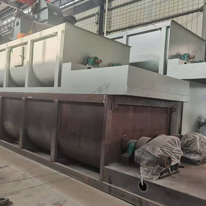 針對之前生石灰消化器的不足,我們公司開發(fā)了環(huán)保型生石灰消化器,其工藝如下:生石灰從進料口進入環(huán)保型生石灰消化器進行加水,接著進行雙螺旋消化。此時產(chǎn)生大量帶粉塵的蒸汽。環(huán)保型生石灰消化器是通過風(fēng)機給水箱產(chǎn)生負壓,然后把外來含有粉塵的蒸汽通過引風(fēng)管吸入水箱,這樣粉塵遇水沉淀,而蒸汽遇水則成水了。生成的沉淀在水箱里與外來加水混合后然后由水泵抽走,再給生石灰消化器加水。這樣就實現(xiàn)了除塵和除塵后的污水循環(huán)利用的過程。就完全解決了濕式除塵利用率低和二次水污染問題。含有粉塵的蒸汽是通過多個除塵篩管進入水箱的,每個篩管上又打有多個小孔,這樣蒸汽其實就是通過小孔進入水中的。這樣每個小孔吹水泛起的水花就不會有粉塵被帶走了,從而達到除塵效率高的特點。