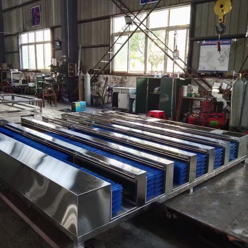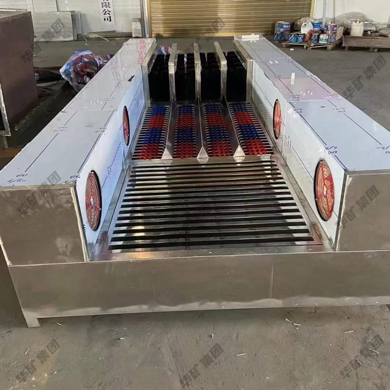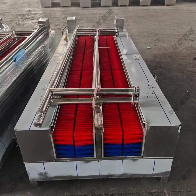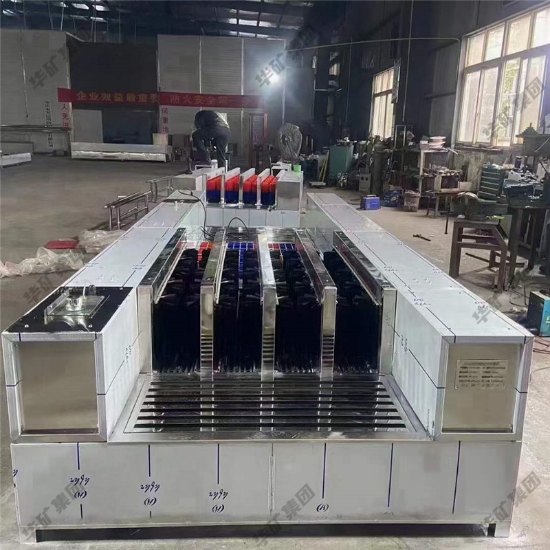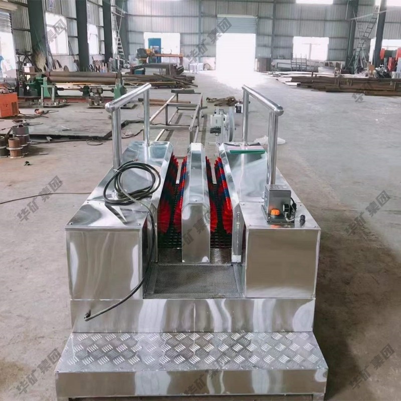 礦用洗靴機(jī)是井下人員升井后通過(guò)洗靴機(jī)時(shí),洗靴機(jī)全智能控水、電、動(dòng)力系統(tǒng)的運(yùn)行,可以一次性洗凈靴子底紋和靴面靴筒上的煤泥,保持靴子表面的清潔。礦用洗靴機(jī)是主要由洗靴系統(tǒng)、支撐部件、傳動(dòng)系統(tǒng)、電控系統(tǒng)、連接部件、人體行走扶手等構(gòu)成,安置在井口或副井井口洗靴池處。升井人員走至洗靴機(jī)時(shí),人體紅外線(xiàn)傳感器便會(huì)指令自動(dòng)打開(kāi)傳動(dòng)系統(tǒng)和噴淋系統(tǒng),礦工行走或任意停留在刷洗靴機(jī)中間,就可自動(dòng)把膠靴底、靴面、靴幫、靴尖、靴跟刷得干干凈凈,徹底解決了員工升井后還要用手刷靴,費(fèi)時(shí)費(fèi)力還刷不干凈的問(wèn)題,減輕了員工勞動(dòng)強(qiáng)度,保持了井口衛(wèi)生,減輕了粉塵污染,又能節(jié)約用水,是礦井標(biāo)準(zhǔn)化建設(shè)的可靠產(chǎn)品。