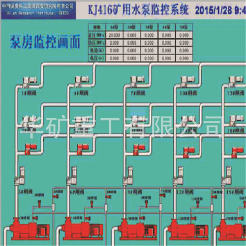 KJ416礦用水泵監(jiān)控系統(tǒng)是一套可對(duì)礦井水泵抽排水進(jìn)行集中監(jiān)控并能實(shí)現(xiàn)遠(yuǎn)程實(shí)時(shí)監(jiān)控的現(xiàn)代化控制系統(tǒng),該系統(tǒng)解決了現(xiàn)有礦井排水系統(tǒng)開泵程序繁瑣,發(fā)生透水事故時(shí)無人開啟備用水泵,系統(tǒng)故障以及排水效率低下等問題。本系統(tǒng)通過各種先進(jìn)可靠的傳感器、保護(hù)器、電動(dòng)閘(球)閥、監(jiān)控電視等監(jiān)測(cè)煤礦井下排水系統(tǒng)各設(shè)備的工作狀態(tài),實(shí)現(xiàn)井下水位、水壓、水泵排水系統(tǒng)的自動(dòng)監(jiān)控,及時(shí)發(fā)現(xiàn)系統(tǒng)存在的隱患與故障點(diǎn)。此外,將監(jiān)測(cè)到的數(shù)據(jù)實(shí)時(shí)通過光纖上傳至地面上位系統(tǒng)可方便實(shí)現(xiàn)井下泵房遠(yuǎn)程控制。該系統(tǒng)與KJ117礦井水文監(jiān)測(cè)系統(tǒng)的聯(lián)動(dòng),可以實(shí)時(shí)監(jiān)控礦井上下水文觀測(cè)孔水壓、水溫、流量以及采空區(qū)水位,排水明渠等水文參數(shù),通過多種傳感器的實(shí)時(shí)監(jiān)測(cè)可實(shí)現(xiàn)對(duì)煤礦透水事故的預(yù)警,事故通過井下光纜將數(shù)據(jù)傳輸至生產(chǎn)調(diào)度中心監(jiān)控平臺(tái),系統(tǒng)預(yù)留井下通訊接口,并以指揮井下人員在發(fā)生透水事故時(shí)的緊急撤離,為及時(shí)啟動(dòng)礦井水災(zāi)應(yīng)急救援和最大限度地保證煤礦安全生產(chǎn)提供可靠技術(shù)手段。