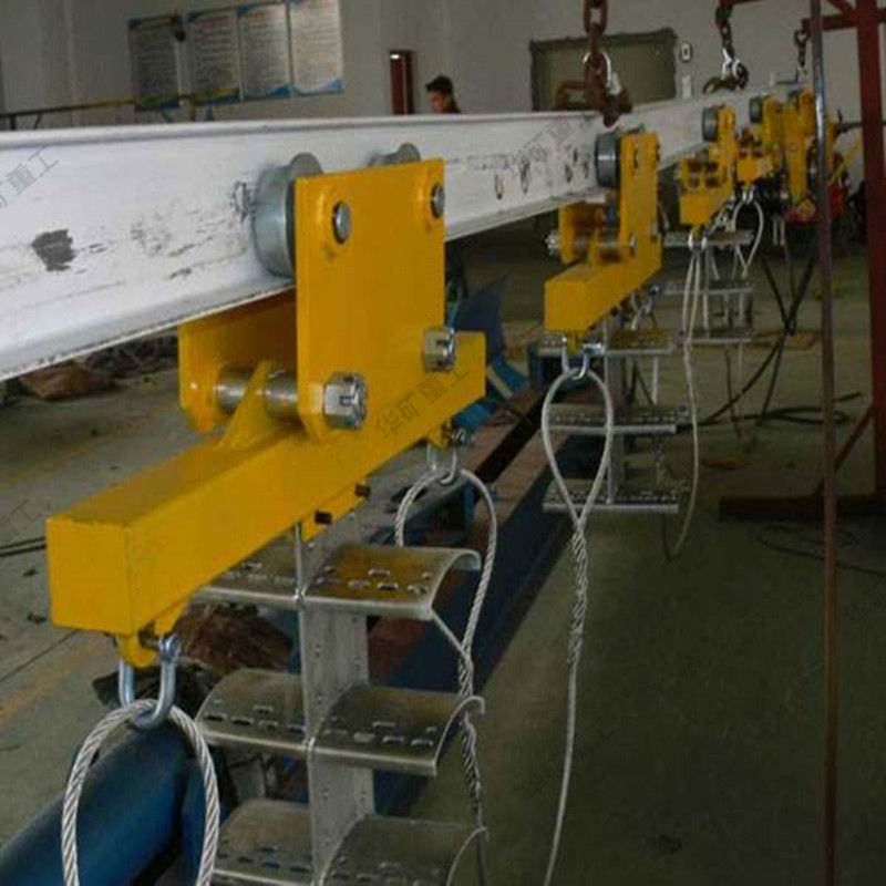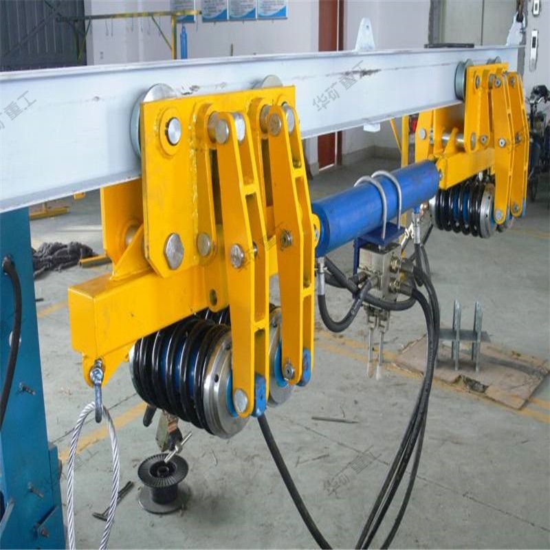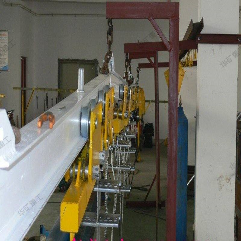 單軌吊車是用一條吊掛在巷道上空的特制工字鋼作軌道,由具有各種功能的吊掛車輛連成車組,用牽引設(shè)備牽引,沿軌道運行的系統(tǒng)。其牽引動力可由鋼絲繩、柴油機(jī)、蓄電池或風(fēng)動裝置提供。