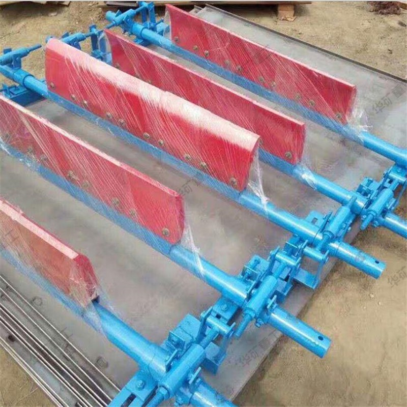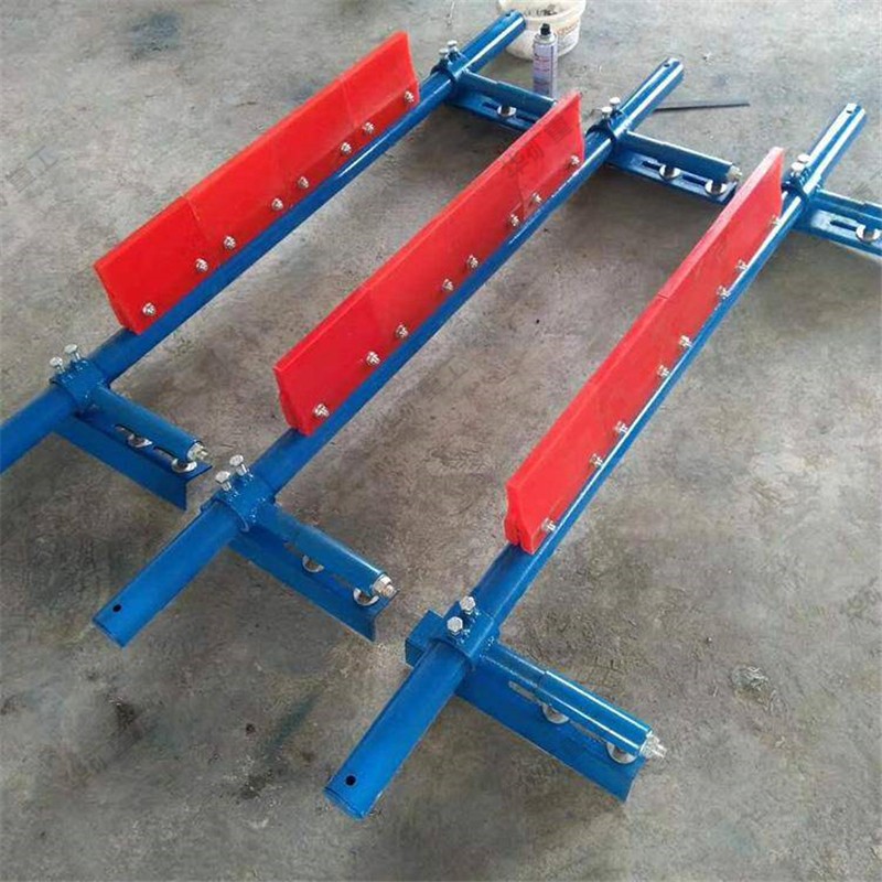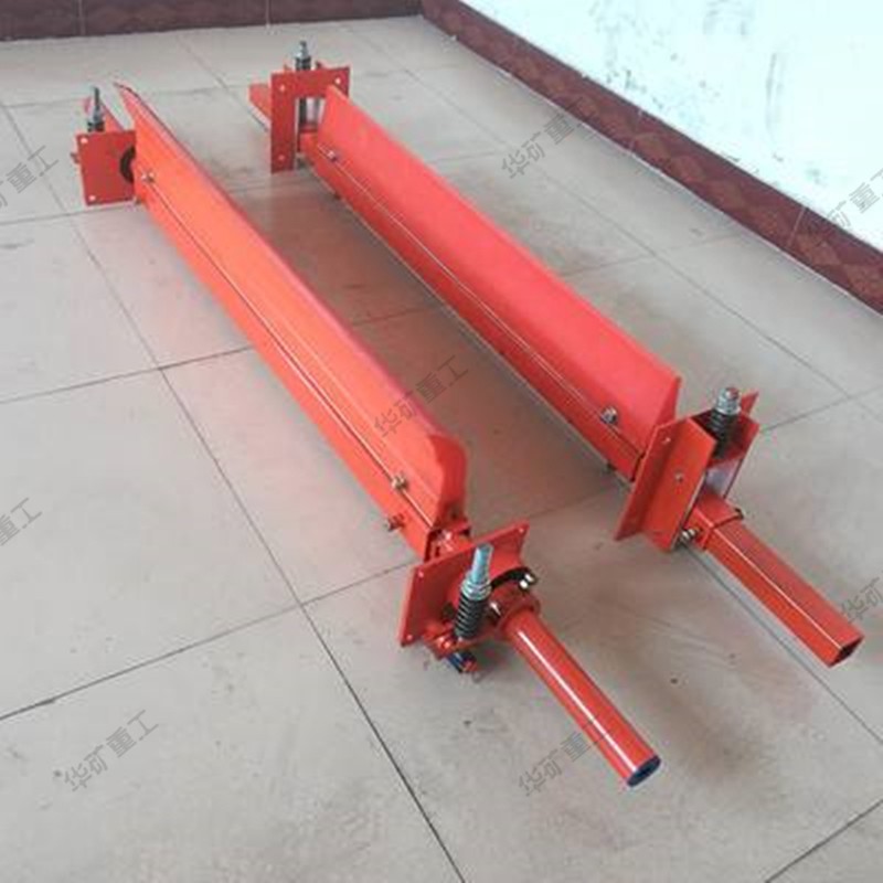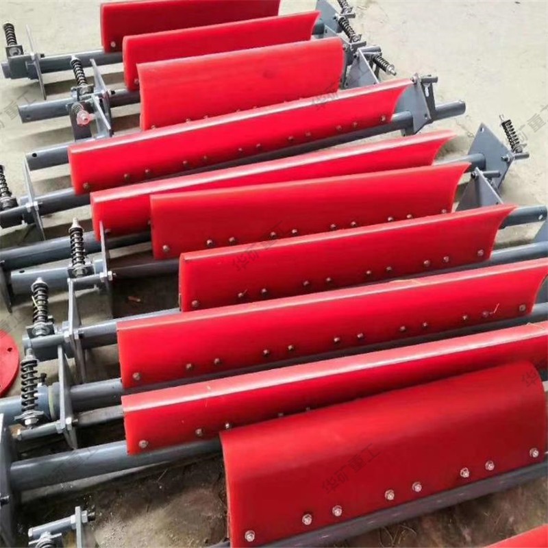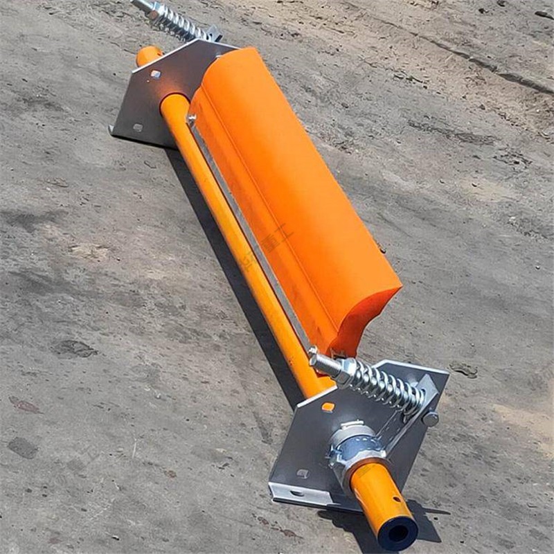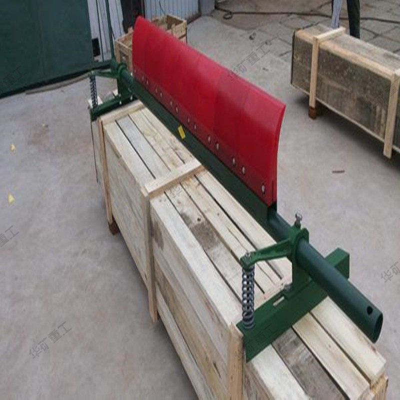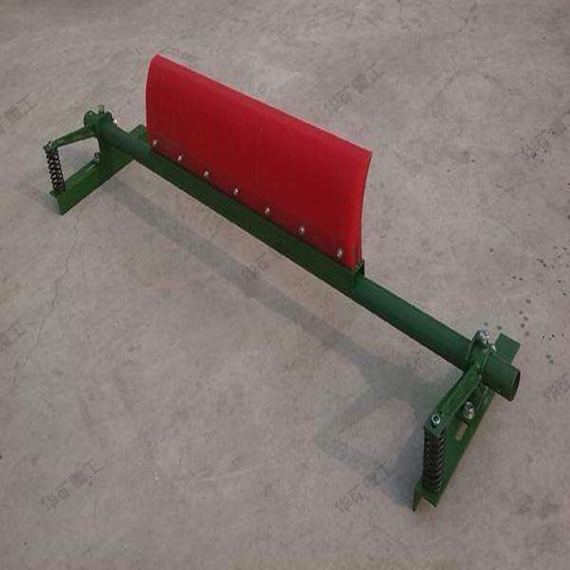 清掃器,刮板借彈簧壓力緊貼輸送帶的載荷面清掃卸載后粘結(jié)在輸送帶上的煤粉。清掃器在輸送機上有著不可忽視的作用。在運行中,如果人為的清除機尾滾筒附著物,往往容易發(fā)生嚴重人身傷亡事故。而清掃器有及時、方便地、快速的清除滾筒附著物的特點。